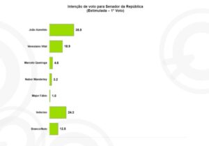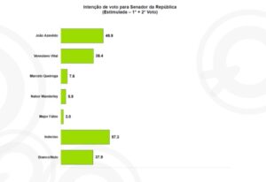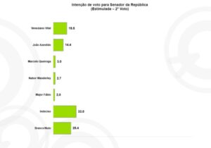 No caso do segundo voto, o cenário se inverte parcialmente: Veneziano Vital lidera com 19,5%, seguido por João Azevêdo com 14,4%. Marcelo Queiroga aparece com 3,0%, Nabor Wanderley com 2,7% e Major Fábio com 2,0%. O índice de indecisos sobe para 33%, enquanto os brancos/nulos atingem 25,4%.