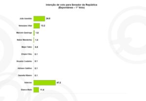 Na pesquisa espontânea, ou seja, naquela em que o eleitor fica livre para dizer o nome que preferir, João Azevêdo segue na liderança para o primeiro voto e Veneziano também se mantém como a escolha dos entrevistados para o segundo voto.